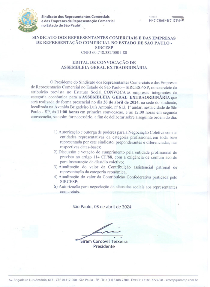 Assembleias Gerais SIRCESP - 24 e 26/04