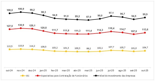 O Índice de Expectativas do Empresário do Comércio (IEEC), outro subíndice do ICEC, apresentou reação após três meses seguidos de queda, período em que atingiu a menor pontuação desde julho de 2020. O indicador marcou 117 pontos, subindo 2,9% na comparação mensal, mas ainda com queda de 17,4% em relação a outubro de 2024.